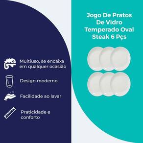 Elaborados para realçar suas refeições e apresentações culinárias, esse jogo de pratos de vidro, composto de 06 peças, é a escolha perfeita para ocasiões especiais ou para o uso diário em sua casa. Mostre elegância em sua mesa com o jogo de pratos de vidro temperado Oval Steak. Transforme suas refeições em experiências memoráveis. Também é um item muito utilizado para presentear seus amigos e familiares, principalmente em casamentos.
