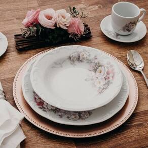A delicadeza das rosas e a sutileza dos tons pásteis é o que define uma das decorações mais tradicionais da marca. O jogo é composto por 12 pratos fundos com 23 cm.