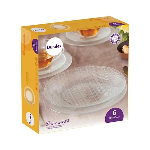 O jogo de pratos fundos Duralex Diamante deixará sua mesa mais prática ao servir as refeições. O jogo é composto por 6 pratos fundos, ideais para servir sopas e massas, fabricados em vidro temperado, proporcionando maior resistência a impactos e que podem ser levados ao microondas, freezer, geladeira e lava-louças. Indicado para:Sopas e massasDimensões do Produto: 22,4x 3,1 cmPeso: 0,35 kgDica de uso e preservação:Para limpeza, remova a sujeira com uma esponja macia, tire todo o resíduo de sabão e seque bem.Não utilize abrasivos ou utensílios pontiagudos.Submeter o vidro a mudanças bruscas de temperatura pode causar choque térmico e danificar seu produto.Evite impactos.