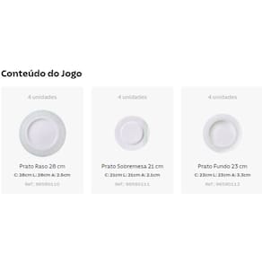 CONTEÚDO - 4 Prato Fundo 23 cm - 96580112 - 4 Prato Raso 28 cm - 96580110 - 4 Prato Sobremesa 21 cm - 96580111