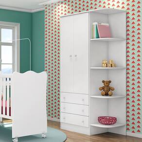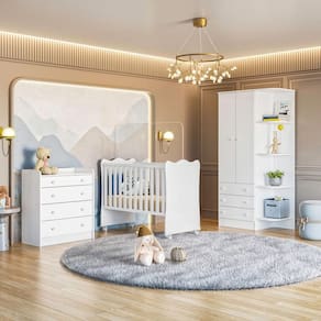 • Informações adicionais: Guarda roupa possui cantoneira, berço possui suporte mosqueteiro, estrado regulável em três alturas, 4 rodízios e a cômoda possui espaço para trocador