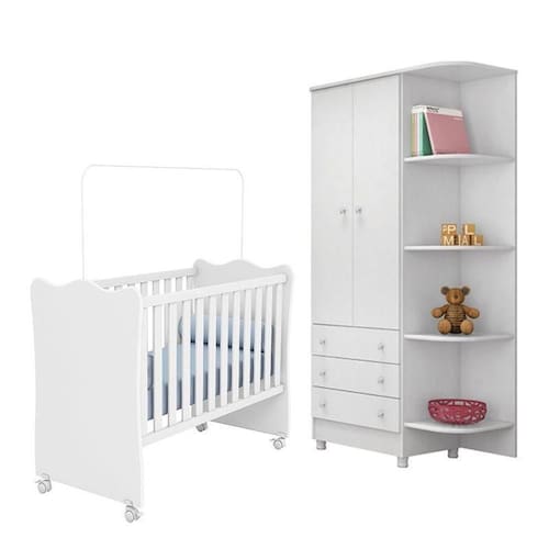 Jogo De Quarto Doce Sonho Guarda Roupa 2 Portas E Berço Branco Com Rodízio - Qmovi Branco Jogo de Quarto Infantil Doce Sonho Guarda Roupa 2 Portas e Berço com Rodízio - Qmovi O Jogo de Quarto Infantil Doce Sonho possui design clean e delicado, perfeito para decorar e organizar o quartinho do bebê. Ele é composto pelo Guarda-Roupa Doce Sonho com amplo espaço garantindo praticidade para o dia a dia. Já o Berço Doce Sonho foi projetado para proporcionar a e o conforto que seu filho merece. Guarda Roupa Infantil 2 Portas e 3 Gavetas Doce Sonho com Nicho e Pés - Qmovi - Estrutura em MDP - Pintura UV atóxica - 2 Portas - 3 Gavetas - Corrediças metálicas - Puxadores em forma de estrela - Prateleiras - Cabideiro - Pés em PVC - Maior organização e praticidade