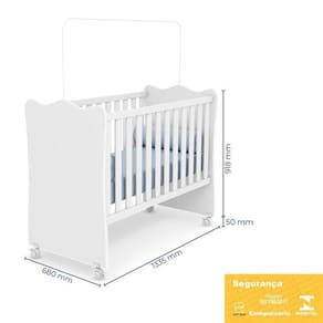 Berço Doce Sonho com Rodízio - Qmovi - Estrutura em MDP - Pintura UV atóxica - Padrão - Grades fixas - Estrado e travessas em MDF - Acabamento das bordas com perfil PVC - Estrado regulado em 3 alturas: 1- 35cm, 2- 48cm, 3- 61cm - Acompanha suporte para mosquiteiro - Certificado compulsório do INMETRO 007190/2017 - 4 Rodízios, sendo 2 com trava - Colchão recomendado 60x130cm - Não acompanha colchão