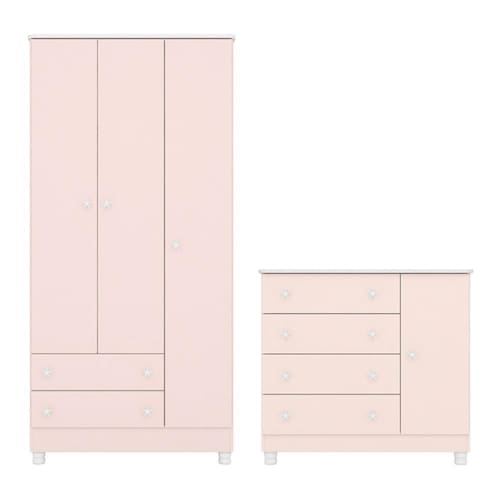 Jogo de Quarto Infantil Doce Sonho Guarda Roupa 3 Portas e Cômoda 1 Porta com Pés - Qmovi Com o Jogo de Quarto Infantil Doce Sonho você terá maior funcionalidade e elegância no quarto do bebê. Ele conta com Guarda-Roupa e Cômoda Doce Sonho, ambos com amplo espaço para guardar e organizar os pertences de forma funcional para o dia a dia. Seus puxadores exclusivos em forma de estrela vão transformar o ambiente deixando-o mais divertido e charmoso.