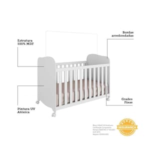 O Jogo de Quarto Infantil com Cômoda Smim e Berço Uli da Móveis Peroba é a escolha ideal para quem busca funcionalidade e segurança no dia a dia com o bebê. A cômoda conta com 3 gavetas amplas com corrediças telescópicas, puxadores pontuais em plástico e tampo com perfil PVC, oferecendo ótimo espaço para organização. Já o berço Uli, certificado pelo INMETRO, possui estrutura em MDF, 3 níveis de regulagem do estrado, rodízios com trava e suporte para mosquiteiro, proporcionando conforto e praticidade. Um conjunto completo com design encantador e acabamento de qualidade.