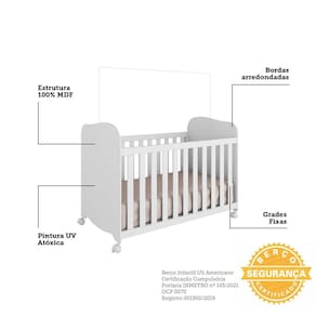 Berço Americano Uli - Móveis Peroba Estrutura em MDF Pintura UV atóxica Certificado pelo INMETRO 001950/2019 Padrão americano 3 Regulagens de altura do estrado Bordas arredondadas e laqueadas Grades fixas 4 Rodízios sendo 2 com trava e 2 sem trava Suporta até 40kg Acompanha suporte mosquiteiro Colchão recomendado 130 x 70 cm Não acompanha colchão Não possui a opção de montagem como mini cama
