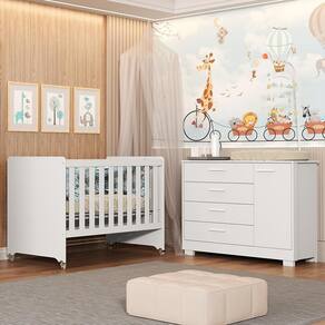 O conjunto perfeito para o quarto do bebê, unindo praticidade, segurança e design moderno. A Cômoda Infantil Zaki conta com 1 porta e 4 gavetas espaçosas, estrutura em MDF com pintura UV atóxica, corrediças telescópicas e puxadores em MDF. Possui sistema antitombamento e pés em PVC que garantem mais estabilidade e durabilidade. O Berço Evolution 4 em 1 pode ser utilizado como mini berço, berço, sofá-cama e mini cama, acompanhando todas as fases do bebê. Possui estrutura em MDF com pintura UV, 3 regulagens de altura do estrado e rodízios em gel (2 com trava e 2 sem trava), oferecendo mobilidade e segurança. Certificado pelo INMETRO, garante tranquilidade para os pais e conforto para o bebê.