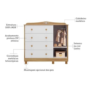 O Jogo de Quarto Infantil Elô é perfeito para compor um ambiente funcional, seguro e cheio de charme para o bebê. O guarda-roupa conta com 4 portas e 4 gavetas com corrediças telescópicas, cabideiro metálico e prateleiras internas, garantindo ótimo aproveitamento do espaço e organização das roupinhas e acessórios. A cômoda acompanha o design clean da linha, com 1 porta com cabideiro, 4 gavetas espaçosas, prateleira interna e puxadores pontuais em plástico. Ambos os móveis são produzidos em MDF com pintura UV atóxica e pés em plástico, unindo durabilidade e segurança em um conjunto que valoriza cada detalhe do quarto infantil.