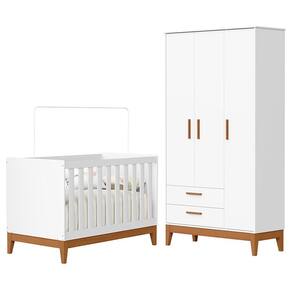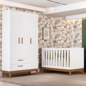 O Jogo de Quarto Infantil Flip oferece praticidade, qualidade e charme para o ambiente do bebê. O guarda-roupa é produzido em MDF com pintura UV atóxica, possui 3 portas com dobradiças metálicas, 2 gavetas com corrediças telescópicas, cabideiro em alumínio, prateleiras internas, puxadores revestidos e pés em madeira, garantindo organização e resistência. Já o berço americano, que se transforma em mini cama, conta com estrutura em MDF, acabamento fosco, cabeceira arredondada, grade em madeira, 3 regulagens de altura no estrado, pés em madeira e certificado do INMETRO. Compatível com colchão de 70 x 130 cm (não incluso), o conjunto é perfeito para acompanhar cada fase do crescimento do seu pequeno com conforto e segurança.