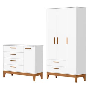 O Jogo de Quarto Infantil Flip é perfeito para trazer praticidade, segurança e estilo ao quarto do bebê. O guarda-roupa é produzido em MDF com pintura UV atóxica, possui 3 portas com dobradiças metálicas, 2 gavetas com corrediças telescópicas, cabideiro em alumínio, prateleiras internas bem distribuídas, puxadores revestidos e pés em madeira, oferecendo organização e resistência. A cômoda, também em MDF com pintura UV atóxica, conta com 1 porta com prateleira móvel, 4 gavetas com corrediças telescópicas, puxadores revestidos, tampo com cantos arredondados, sistema antitombamento e pés em madeira, garantindo funcionalidade e segurança no dia a dia. Um conjunto completo para deixar o quarto do seu pequeno ainda mais aconchegante e organizado.