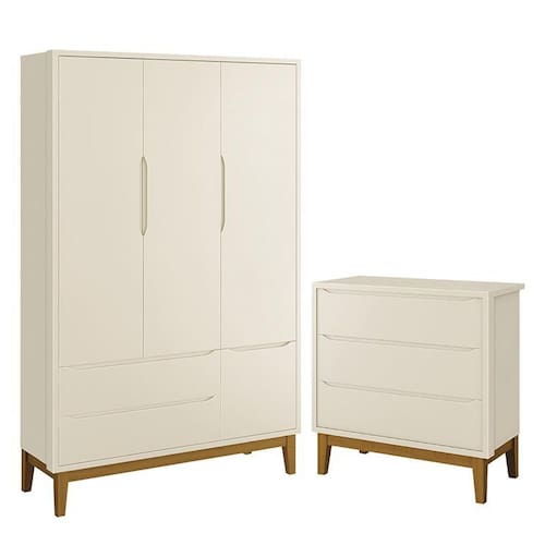 Jogo de Quarto Infantil Guarda Roupa 3 Portas e Cômoda 3 Gavetas Classic com Pés Amadeirado - Reller Móveis - Bege Claro