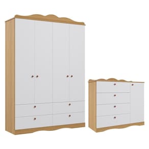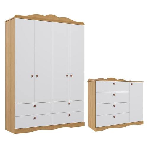 Jogo De Quarto Infantil Guarda Roupa E Cômoda Nature/branco - Permóbili Baby Nature/branco Jogo de Quarto Infantil Guarda Roupa e Cômoda - Permóbili Baby O Jogo de Quarto Infantil inclui um Guarda-Roupa e uma Cômoda. O Guarda-Roupa tem 4 portas, 4 gavetas com corrediças telescópicas, cabideiro em alumínio, várias prateleiras e nichos, garantindo ótima organização. Feito de 100% MDF, material durável e ecologicamente correto, possui acabamento em pintura UV e puxadores de plástico ABS resistentes. A moldura com curvas no estilo provençal adiciona um toque decorativo. A Cômoda tem 4 gavetas amplas, uma porta com prateleira interna e cabideiro ajustável. Feita de 100% MDF, com bordas arredondadas e pintura atóxica, oferece resistência e durabilidade e os puxadores de plástico ABS completam o design. Guarda Roupa Infantil 4 Portas e 4 Gavetas - Permóbili Baby - Estrutura em MDF - Pintura UV - 4 Portas - Dobradiças metálicas - 4 Gavetas - Corrediças telescópicas - Cabideiro de alumínio - Nichos e prateleiras - Puxadores em ABS - Suporta até 3Kg em cada gaveta