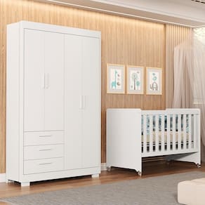 Um conjunto funcional e elegante, pensado para oferecer praticidade, conforto e segurança no quarto do bebê. O Guarda Roupa Infantil Zaki conta com 4 portas e 3 gavetas amplas, estrutura em MDF com pintura UV atóxica, corrediças telescópicas e puxadores em MDF. Possui cabideiro metálico e pés em PVC, garantindo resistência e durabilidade. O Berço Evolution 4 em 1 pode ser utilizado como mini berço, berço, sofá-cama e mini cama, acompanhando cada fase do crescimento da criança. Fabricado em MDF com pintura UV, possui 3 regulagens de altura do estrado, rodízios em gel (2 com trava e 2 sem trava) e é certificado pelo INMETRO, proporcionando praticidade e segurança.