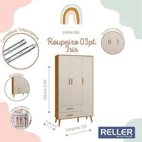 Jogo De Quarto Infantil Isis Guarda Roupa 3 Portas E Berço Areia/savana - Reller Móveis Areia/savana Jogo de Quarto Infantil Isis Guarda Roupa 3 Portas e Berço - Reller Móveis O Jogo de Quarto Infantil Isis é composto por um Guarda-Roupa e um berço. O Guarda Roupa Isis 3 Portas e 2 Gavetas além de muito estiloso, oferece amplo espaço para organizar os pertences do seu bebê e seus puxadores são em madeira. E o Berço Americano Isis é ideal para quem busca um berço lindo para a chegada do seu bebê. O berço se enquadra em todos os termos de qualidade, segurança e durabilidade do produto, pois possui certificação pelo INMETRO. A elegância do estilo retrô aliada ao conforto. Guarda Roupa Infantil Isis 3 Portas e 2 Gavetas - Reller Móveis - Estrutura 100% MDF - Pintura UV atóxica - Acabamento fosco - 3 Portas - Dobradiças metálicas - 2 Gavetas - Corrediças telescópicas - Cabideiro metálico - Prateleira interna - Puxadores em madeira - Pés estilo retrô em madeira - Amplo espaço interno