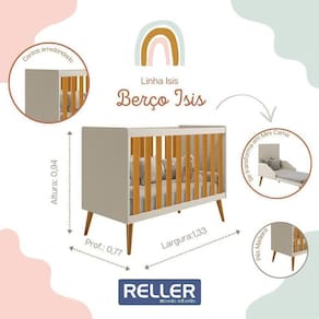 Berço Americano Isis - Reller Móveis - Estrutura 100% MDF - Pintura UV atóxica - Acabamento fosco - Certificado pelo INMETRO 009882/2022 - Padrão americano - Cantos arredondados - Transforma-se em mini cama - Estrado em MDF - 3 Regulagens de altura do estrado - Acompanha suporte para mosquiteiro - Pés estilo retrô em madeira - Colchão recomendado 70x130 cm - Não acompanha colchão