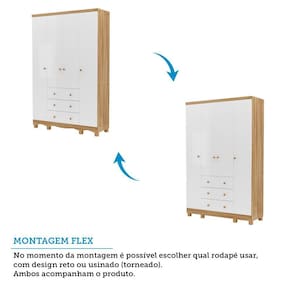 O Jogo de Quarto Infantil Júnior com Guarda-Roupa 4 Portas e Cômoda 1 Porta da é perfeito para manter o quarto do bebê bem organizado e funcional. O guarda-roupa possui 4 portas, 3 gavetas com corrediças telescópicas, cabideiro metálico e prateleira. Fabricado em MDF com pintura UV atóxica, conta com puxadores em plástico, pés resistentes e duas opções de rodapé: usinado ou reto. A cômoda complementa o conjunto com 1 porta, cabideiro, prateleira interna e 4 gavetas espaçosas. Também em MDF, com os mesmos acabamentos e rodapés, oferece excelente espaço para organização do enxoval. Um conjunto prático, seguro e com ótimo aproveitamento de espaço para o quarto infantil.