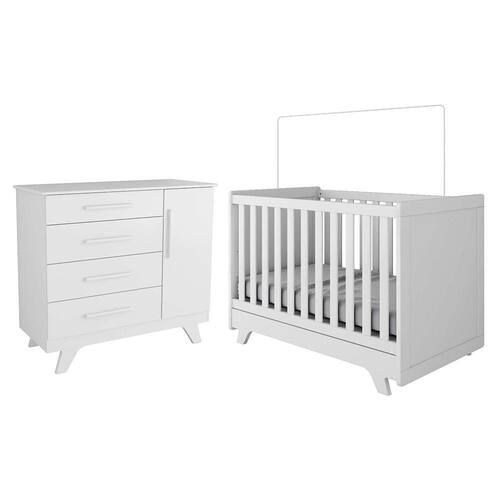 O Jogo de Quarto Infantil Retrô combina charme clássico com funcionalidade para o dia a dia. A cômoda possui estrutura em MDF com pintura UV atóxica, 1 porta com cabideiro e prateleira interna, além de 4 gavetas com corrediças telescópicas. Os puxadores e pés em MDF reforçam o visual retrô e garantem durabilidade. O berço 2 em 1 pode ser utilizado como berço ou mini cama. Conta com 3 regulagens de altura do estrado, grades fixas, suporte para mosquiteiro e bordas laqueadas. Certificado pelo INMETRO e recomendado para colchão 130 x 70 cm (não incluso). Um conjunto funcional, seguro e com design encantador para o quarto do bebê.
