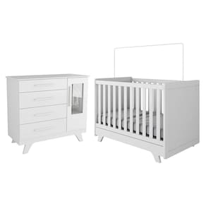 O Jogo de Quarto Infantil Retrô Janelas traz um design encantador e funcional para o quarto do bebê. A cômoda conta com 1 porta com janela em PETG Cristal, cabideiro, prateleira interna e 4 gavetas com corrediças telescópicas. Estrutura em MDF com pintura UV atóxica, puxadores e pés em MDF revestidos completam o visual retrô com charme e durabilidade. O berço 2 em 1 pode ser utilizado como berço ou mini cama, possui 3 regulagens de altura do estrado, grades fixas, bordas arredondadas e suporte para mosquiteiro. Certificado pelo INMETRO, é recomendado para colchão 130 x 70 cm (não incluso). Um conjunto prático, seguro e cheio de estilo para acompanhar os primeiros anos do bebê.