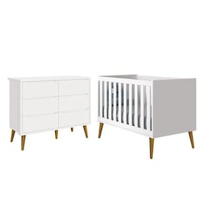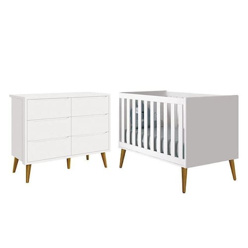 Jogo De Quarto Infantil Theo Cômoda 6 Gavetas E Berço Branco Fosco Com Pés Amadeirado - Reller Móveis Branco Fosco