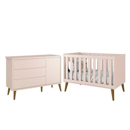 Jogo de Quarto Infantil Theo Retrô Cômoda 1 Porta e Berço com Pés Amadeirado - Reller Móveis - Rosa
