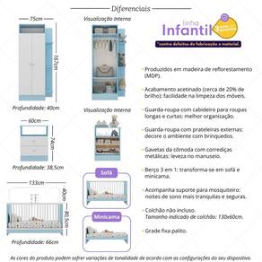 Produzido em madeira de reflorestamento (MDP) com acabamento acetinado (cerca de 20% de brilho), este quarto de bebê garante durabilidade e resistência. O guarda-roupa oferece 2 portas espaçosas, cabideiro em madeira revestido para roupas curtas e longas, além de um nicho prático e 3 prateleiras externas, garantindo organização impecável para todas as peças e acessórios do seu filho. Com sistema antitombamento, a cômoda complementa o ambiente com seu nicho multifuncional e 2 gavetas amplas, equipadas com corrediças metálicas que oferecem abertura suave. Os puxadores redondos em ABS dão um toque de delicadeza e charme ao design, tornando o quarto ainda mais aconchegante.