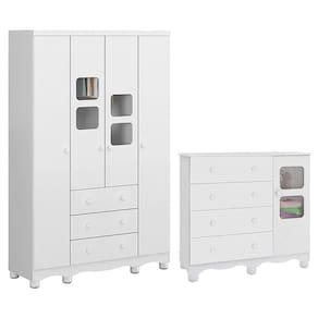 O Jogo de Quarto Infantil Uli com Guarda-Roupa 4 Portas e Cômoda é ideal para quem busca organização, segurança e um visual delicado no quarto do bebê. O guarda-roupa oferece 4 portas, sendo as centrais com janelas em acrílico, além de 3 gavetas com corrediças telescópicas, prateleiras, cabideiro metálico e ótimo espaço interno. Fabricado em MDF com pintura UV atóxica, possui puxadores em plástico, pés resistentes e duas opções de rodapé: usinado ou reto. A cômoda complementa o conjunto com 1 porta com janela, prateleira interna, cabideiro e 4 gavetas espaçosas, mantendo o mesmo padrão de qualidade, estrutura e acabamento. Um conjunto funcional e completo para manter tudo no lugar com charme e praticidade.