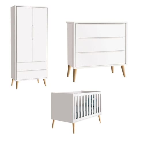 O Jogo de Quarto Bebê 2PTs Theo New - RELLER, é perfeito para o quartinho do seu baby. Possui pés em madeira maciça no estilo palito que contribuem para o ar retrô, as peças introduzem um desing clean que combinam com vários estilos de decoração. Contempla um Berço que exala personalidade e delicadeza, podendo transformar-se em mini cama futuramente, uma Cômoda Gaveteiro com três gavetas e um Roupeiro de duas portas e duas gavetas, super amplos, espaçosos e com divisórias internas, são ideais para uma perfeita organização das roupinhas e itens do seu bebê.