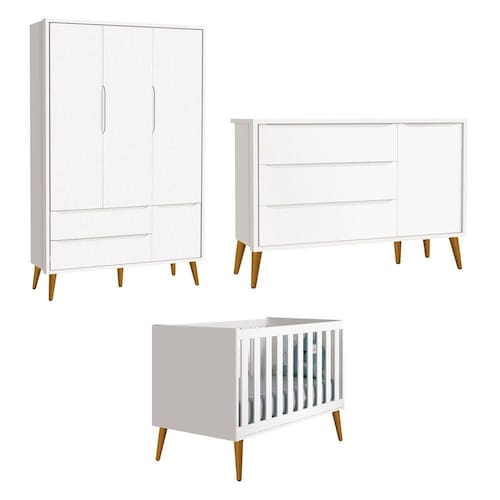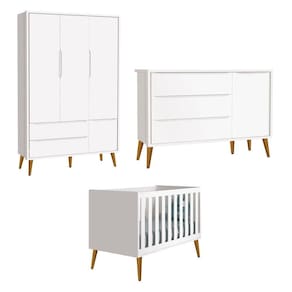 O Jogo de Quarto Bebê 3PTs Theo New - RELLER, é ideal para o quartinho do seu baby. Possui pés em madeira maciça no estilo palito que contribuem para o ar retrô, as peças detém de um desing clean que combinam com vários estilos de decoração. Contempla um Berço que exala personalidade e delicadeza, podendo trnasformar-se em mini cama futuramente, uma Cômoda Sapateira com três gavetas e uma porta, e um Roupeiro de três portas e duas gavetas, super amplos, espaçosos e com divisórias internas, são ideais para uma perfeita organização das roupinhas e itens do seu bebê.