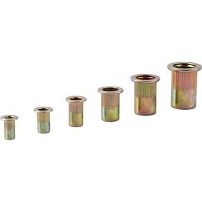 Tipo de rebites: Rebite com rosca | Material do corpo: Aço carbono | Acabamento: Zincado | Diâmetro do furo indicado: M3 (5,1 mm); M4 (6,1 mm); M5 (7,1 mm); M6 (9,1 mm); M8 (11,1 mm); M10 (13,1 mm). | Espessura da chapa indicada: M3 (0,5 mm a 2,0 mm); M4 (0,5 mm a 2,0 mm); M5 (0,5 mm a 2,5 mm); M6 (0,5 mm a 3,0 mm); M8 (0,5 mm a 3,5 mm); M10 (0,5 mm a 3,5 mm). | Observação: M3 ao M10 com 150 peças.