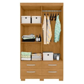 O guarda roupa é feito em MDP 15mm.Possui 4 gavetas com corrediças telescópicas, 4 Portas, 2 prateleiras e 1 cabideiro.