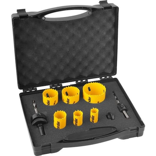 1 haste/suporte n 1 de 1/4 e rosca de 1/2 UNF com broca piloto de aço rápido de 1/4, 1 haste/suporte n 2 de 3/8 e rosca de 5/8 UNf com broca piloto de aço rápido de 1/4, 1 adaptador/redutor com rosca de 5/8 UNf para rosca de 1/2 UNf, 1 serra copo de aço rápido 19 mm com rosca de 1/2, 1 serra copo de aço rápido 22 mm com rosca 1/2, 1 serra copo de aço rápido 29 mm com rosca de 1/2, 1 serra copo de aço rápido 38 mm com rosca de 5/8, 1 serra copo de aço rápido 44 mm com rosca 5/8 e 1 serra copo de aço rápido 57 mm com rosca de 5/8 Dados do produto Garantia : 90 Dias Marca : Vonder NCM: 82029990 EAN: 7893946407162 Dados de Embalagem Peso Total Produto + Embalagem : 1630 gr Altura : 36 cm Largura : 28 cm Profundidade : 43 cm Ean: 7893946407162