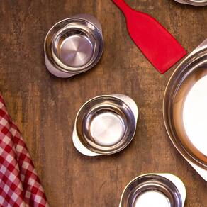 Conteúdo: 1 jogo de tigelas inox, sendo 6 tigelas cumbucas e 6 colheres de sobremesa;