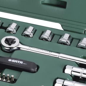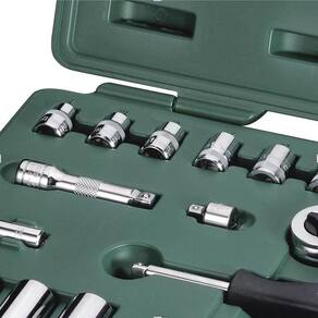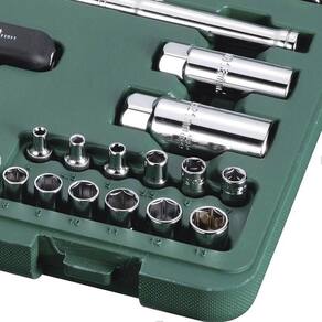 Jogo de soquetes sextavado fabricado em aço cromo vanádio proporcionando resistência e durabilidade, com cabo fixo que pode ser utilizado como chave canhão, pontas philips, fendas e tork, além de dois soquetes de vela e soquetes longos, indicado para o público automotivo em geral