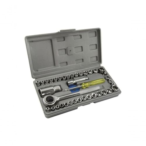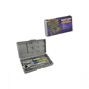Jogo De Soquete Western Com Maleta 39 Pecas Prepare-se para projetos de pequena e média escala com este jogo de soquete Western completo! Contendo 39 peças fabricadas em aço carbono e PVC, este kit oferece durabilidade e resistência para enfrentar qualquer desafio do dia a dia. As ferramentas foram tratadas termicamente para garantir maior resistência, permitido apertos e dessapertos de parafusos com precisão e força. Acompanha adaptor e extensor para alcançar locais de difícil acesso, ampliando as possibilidades de uso.