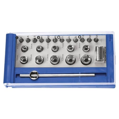 Um jogo com peças de diversos tamanhos, oferece a você ponteiras cruzadas, chatas, hexagonais e ponta trafix para parafusos tork. Com tamanho pequeno, não irá ocupar espaço em sua caixa de ferramentas! Especificações Aplicação Ideal para a utilização na construção civil ou em pequenos reparos Composição 10 soquetes Altura 5 cm Largura 11 cm Comprimento 27.5 cm Peso Bruto 0.5 kg