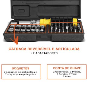 Com esse jogo de Soquetes e Ponteiras da Titanium você tem 41 peças que permitem diversas possibilidades, permitindo que você tenha a chave que precisa sempre a mão, tudo de maneira organizada dentro de uma prática maleta.