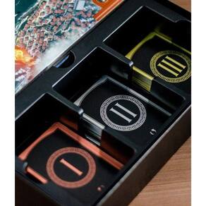 Inserts super divididos e organizados: a caixa é maior devido as cartas que aumentaram e também por causa dos inserts que agora tem um espaço reservado para as moedas, um para as fichas e um para cada era. Menos tempo separando componentes e mais tempo no que realmente importa: jogar