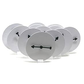 Este kit inclui doze (12) conjuntos de spinners de seta reutilizáveis de duas partes. Cada conjunto inclui uma base estável de 1 5/16" de diâmetro com um ponteiro destacável em forma de seta de 2 3/4". Esses componentes se encaixam e se separam para serem s repetidamente.