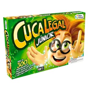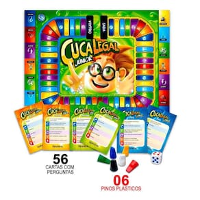 Conteúdo: 1 Jogo de Tabuleiro Cuca Legal Júnior com 1 Tabuleiro, 6 Peões, 1 Dado e 56 Cartas com 6 perguntas cada