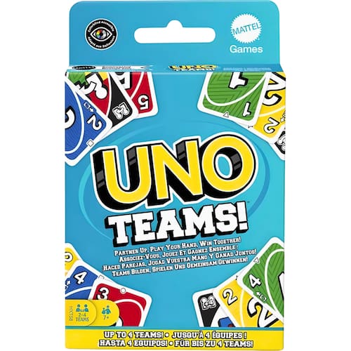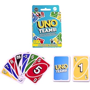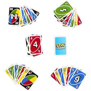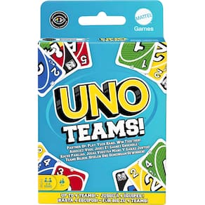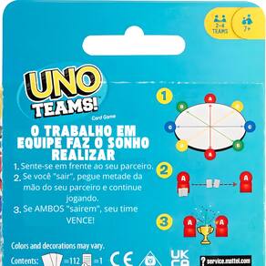 Descrição do produto : " UNO Teams e uma nova maneira de jogar o jogo classico! Os jogadores ainda combinam cor, numero e simbolo, mas em vez de cada um por si, eles se unem em pares e jogam juntos para vencer. Cartas e regras especiais ajudam os companheiros de equipe a trabalharem juntos, mas ambos os jogadores devem se livrar de todas as cartas em suas maos para vencer. E lembre-se, quando voce ou seu parceiro estiver com a ultima carta, nao se esqueca de gritar ""UNO!"". Cartas especiais como Wild Team Play e Wild Team Draw 4 ajudam as equipes a vencer juntas. Jogar uma carta com o símbolo de “passe” fará com que os jogadores poderão passar uma carta de sua escolha para seu parceiro. Se um companheiro sair, ele terá que pegar metade das cartas da mão do parceiro e continuar jogando. Não se esqueçam, quando os jogadores ficam com apenas uma carta, eles (ou o seu parceiro) devem gritar ""UNO!"". : " Detalhes técnicos : Marca: Mattel : Referência: HXT58 : Idade recomendada: 7 : Possui Luzes: Não : Possui Sons: Não : Dimensões aproximadas da embalagem: 14 x 9 x 2 cm (A x L x C) : Ean: 194735238026 : Contém na Embalagem : Inclui 112 cartas e instrucoes.