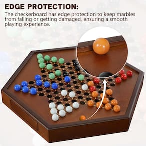 Traga a alegria atemporal das damas chinesas para sua sala de estar com o jogo de tabuleiro de damas chinesas de madeira da DecoWoodo Este jogo de estratégia clássico, feito de madeira premium, adiciona um toque de elegância às suas noites de jogo. A superfície de jogo suave e as cores vibrantes criam uma atmosfera convidativa para competição amigável. Com seu tamanho compacto, você pode facilmente armazená-lo ou levá-lo para qualquer lugar. Se você estiver apresentando o jogo para as gerações mais jovens ou revisitando memórias queridas, esta obra-prima de madeira promete horas de diversão envolvente. Reúna sua família e amigos e deixe os movimentos estratégicos começarem neste tabuleiro de damas chinesas lindamente trabalhado. - Equipado com vidro de 16 mm (0,6 polegadas) bolinhas de gude, o conjunto oferece uma aderência confortável e fácil colocação, adequado para jogadores de todas as idades. O design maior garante que adultos e crianças possam desfrutar do jogo sem esforço - O conjunto inclui 72 bolinhas de gude de vidro coloridas (preto, branco, azul, verde, vermelho, laranja), com 10 bolinhas de gude por cor e dois extras para cada. O quadro possui uma espaçosa gaveta dupla face para facilitar o armazenamento de mármore, com um fecho magnético garantindo um ajuste seguro e armazenamento organizado - O design da borda do tabuleiro evita que as bolinhas escorreguem e sejam danificadas, garantindo uma experiência de jogo mais suave. O tamanho grande da placa permite fácil manobra, enquanto os grandes orifícios mantêm as bolinhas de gude com segurança no lugar. A superfície lisa aumenta o conforto durante o jogo - Este tabuleiro hexagonal é adequado para 2 a 6 jogadores e possui regras fáceis de aprender. Serve como uma ferramenta de jogo e uma bela decoração de mesa. A aparência clássica de madeira a torna uma peça elegante em sua casa, mesmo quando não estiver em uso - As damas chinesas aumentam a concentração e a memória, proporcionando diversão e promovendo conexões. Este conjunto é um presente ideal para festas, reuniões de família ou ocasiões especiais e é perfeito para uso em casa, no escritório ou durante viagens