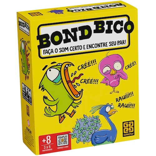 Descrição do produto : " Jogo Bond Bico - Grow A partida mais barulhenta e divertida da sua casa! Prepare-se para uma explosão de risadas com Bond Bico, o jogo onde todo mundo joga ao mesmo tempo e ninguém pode falar... só cantar como passarinho! Imite. Escute. Encontre. Ganhe! Cada jogador precisa imitar o canto das aves das suas cartas e, ao mesmo tempo, ficar de ouvidos atentos para encontrar quem está fazendo o mesmo som. Achou o par? Ganhou um ovo! Mas cuidado...\nTem passarinho que atrapalha tudo! • Papagaio que imita outros sons • Predador faminto pronto para atacar • Ladrão sorrateiro tentando roubar ovos • Pavão metido que quer chamar toda a atenção\nDiversão garantida para todos! Com partidas rápidas, muita interação e sons hilários, Bond Bico é ideal para reunir a família ou os amigos e transformar qualquer momento em uma festa cheia de confusão boa e gargalhadas.\nA partir de 8 anos De 3 a 6 jogadores Duração média: 20 minutos Contém cartas temáticas, ovos colecionáveis e instruções ilustradas Fechar\nComponentes 1 Tabuleiro,1 Baralho, 25 Bolinhas Brancas, 6 Cestas Cartonadas e 1 Regra : "