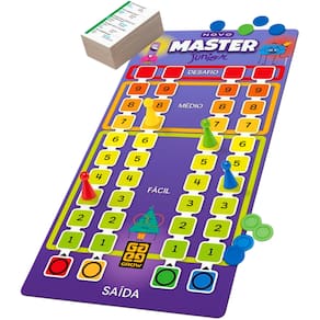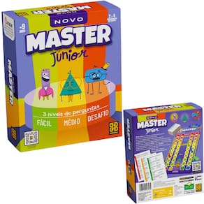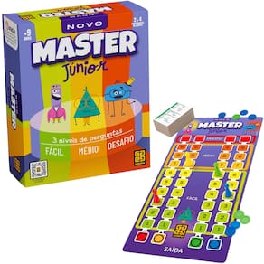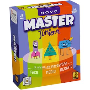 Descrição do produto : " Master Júnior é um jogo que desafiará o conhecimento de seus participantes em diversos temas. Quem será o jogador que irá mais longe no tabuleiro? A cada pergunta respondida corretamente, você avança uma casa. À medida que você vai mais longe no tabuleiro, as perguntas mudam de dificuldade: de Fácil para Média. E, quando chegar á ultima casa, você poderá responder a pergunta no nível ""DESAFIO"". Porém responda com cuidado. A cada erro, você gasta uma vida e, se ficar sem nenhuma, estará fora do jogo!\nMaster Júnior. Porque é perguntando que se aprende!\nIdade: A partir de 9 anos Participantes: De 2 a 4 Tempo estimado de jogo: 40 minutos\nComponentes 155 Cartas de nível fácil, 45 Cartas de nível médio, 24 Cartas desafio, 4 Peões, 1 Tabuleiro, 12 Fichas bônus verdes, 4 Fichas Bônus azuis e 1 Regra : "
