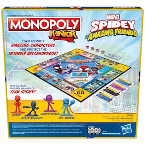 Jogo de tabuleiro Hasbro Gaming Monopoly Junior: Marvel Spidey and His Amazing Friends Edition para crianças a partir de 5 anos, com arte da série animada, jogos de tabuleiro infantis - INSPIRADO EM SPIDEY E SEUS INCRÍVEIS AMIGOS SÉRIE ANIMADA: Neste jogo Monopoly Junior: Marvel Spidey and His Amazing Friends, junte-se a personagens incríveis para proteger a vizinhança amigável - JOGUE COMO MEMBRO DO TEAM SPIDEY: Inclui 4 jogos Monopoly Junior fichas. As crianças podem jogar como seu membro favorito do Team Spidey: Spidey, Spider-Man, Ghost-Spider ou Ms. Marvel - TABULEIRO DE JOGO COM TEMA DE ARANHA: Neste jogo infantil Monopoly Junior, as propriedades são substituídas por personagens incríveis da Marvel que os fãs do Aranha reconhecerão, como Homem-Formiga, Doc Ock, Homem de Ferro, Vespa e Hulk - COLETE TAXAS DE TRABALHO EM EQUIPE: os jogadores se movem pelo tabuleiro juntando-se a Amazing Characters e cobrando taxas de trabalho em equipe. O jogador com mais dinheiro de Monopólio no final vence - JOGABILIDADE SIMPLIFICADA DE MONOPÓLIO: Este divertido jogo infantil é uma boa introdução ao jogo Monopólio para crianças. Ele foi projetado para ser rápido, divertido e empolgante para jogadores mais jovens — Ótimo presente para fãs de Spidey: este jogo pré-escolar Spidey é muito divertido para brincadeiras, noites de jogos em família e dias chuvosos, e é um ótimo presente para meninos e meninas de 5 anos ou mais