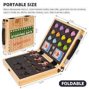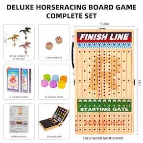 Apresentando o melhor jogo de tabuleiro de corrida de cavalos de 21" feito de madeira maciça premium para uma durabilidade imbatível. Desdobra-se em generosos 21 x 11,8 polegadas, mas se dobra convenientemente até um tamanho compacto para facilitar o armazenamento e a portabilidade. Participe da DIVERSÃO CLÁSSICA com até 12 JOGADORES, tornando-o o JOGO DE CORRIDA DE CAVALOS PERFEITO para NOITES DE JOGOS EM FAMÍLIA ou VIAGENS. Completo com 60 FICHAS DE PÔQUER, 11 CAVALOS DE METAL, 2 DADOS DE MADEIRA e muito mais, tudo organizado em uma CAIXA DE ESTILO VINTAGE. Nosso conjunto de luxo garante horas de pura emoção baseada na sorte, sem exigir nenhuma estratégia, apenas diversão! Um presente de alta qualidade para qualquer ocasião que promete criar memórias duradouras. Para qualquer dúvida ou preocupação, nossa equipe está sempre pronta para ajudar. Não perca — CONVIDE A EMOÇÃO DA CORRIDA PARA SUA CASA HOJE! - [CONJUNTO DE JOGOS DE CORRIDA DE CAVALOS DELUXE]: O jogo de tabuleiro de corrida de cavalos inclui 60 fichas de pôquer, um tabuleiro de corrida de madeira maciça de alta qualidade, 11 cavalos de metal (4 dourados, 3 verde-oliva), 2 dados de madeira feitos à mão, 2 cartas de baralho, um manual do usuário e uma caixa de armazenamento para uma experiência de jogo de tabuleiro sequencial - [QUALIDADE PREMIUM]: O jogo de corrida de cavalos é feito à mão e polido com madeira de pinho de alta qualidade, criando uma superfície mais lisa e evitando deformações. Com um processo aprimorado, ele possui spray colorido de camada dupla para durabilidade à prova d'água e resistente à corrosão - [ARMAZENAMENTO E PORTABILIDADE CONVENIENTES]: um grande jogo de tabuleiro de corrida de cavalos de 21" pode ser facilmente dobrado até um tamanho compacto de 11,6 x 6,3". A espuma embutida e o design vintage da trava mantêm todos os acessórios bem organizados no estojo de armazenamento - [JOGO DE TABULEIRO CLÁSSICO PARA UMA NOITE DE JOGO]: Jogo de pura sorte! Qualquer pessoa pode começar e jogar sem precisar aprender e descobrir estratégias. O primeiro cavalo de metal a chegar à LINHA DE CHEGADA vence! Até 11 jogadores podem jogar ao mesmo tempo. O jogo de corrida de cavalos Ideal para amigos, família, festas, jogos noturnos ou viagens - [PRESENTE PARA TODOS] O design aprimorado, o artesanato de alta qualidade e a jogabilidade competitiva tornam o jogo de cavalos um emocionante presente de aniversário, Halloween, Dia de Ação de Graças e Natal para qualquer pessoa. Este jogo de corrida de cavalos criará memórias maravilhosas para suas reuniões. Se você tiver alguma dúvida, não hesite em nos contatar