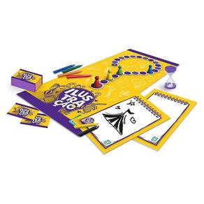 Neste jogo, rapidez e conhecimento vencem a brincadeira! São 240 cartas com nomes de personagens, lugares e com coisas para o jogador representar como preferir: desenho, mímica ou perguntas. Quem adivinhar a palavra em menos tempo com menos dicas ganha mais pontos e avança no tabuleiro. A disputa pode ser individual ou em equipes. Acompanha a ampulheta de tempo, lousinha para desenhar e giz de cera.