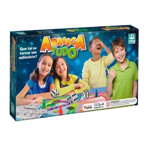 Um jogo que movimenta milhões. Cada jogador recebe 300 bônus, que ele deverá arriscar nas apostar conforme for percorrendo o tabuleiro. Vence o jogo aquele que acumular o maior montante em bônus até o final do jogo. Quer arriscar. Que tal se tornar um milionário. De 2 a 4 jogadores. Recomendado para crianças acima de 9 anos. Imagens meramente ilustrativas.Código de Barras: 7896200750226Código de Referência: 5022Marca: Nig BrinquedosModelo: Jogo de Tabuleiro Arrisca TudoIdade: +9 anosMedidas da Caixa: 45x06x25 cm aproximadamenteCertificado: Inmetro Ce-Bri/Iqb 000202 NM 300/2002 Ocp 0006