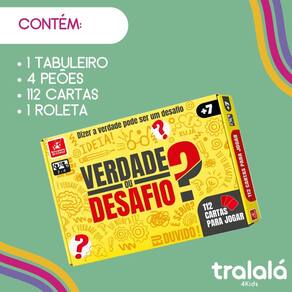 Jogo de Tabuleiro Infantil Perguntas Verdade ou Desafio Verdade ou Desafio é o jogo perfeito para tornar qualquer encontro entre amigos numa experiência inesquecível Simples, emocionante e cheio de surpresas, este clássico coloca os jogadores à prova ao escolherem entre responder a perguntas embaraçosas ou enfrentar desafios ousados e divertidos.