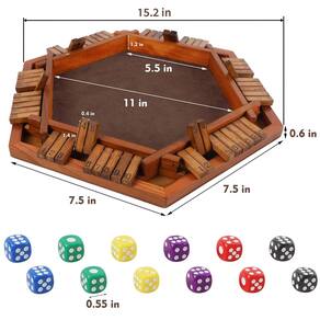 Juegoal Jogo de dados Shut The Box de madeira para 1 a 6 jogadores, jogo de tabuleiro de mesa com 12 dados para crianças e adultos e famílias Este jogo de tabuleiro fechado para toda a família pode proporcionar horas de entretenimento para até seis jogadores ao mesmo tempo devido à sua forma. A placa de madeira está disponível para todos, seja para entretenimento social e familiar ou como uma excelente ferramenta para professores adicionarem e subtraírem números em sala de aula. Este é um jogo de bar clássico, também ótimo para festas ou alguns amigos que gostam de jogos de dados. Feito de material de madeira seguro e não tóxico, de alta qualidade, cuidadosamente polido para garantir que tenha bordas arredondadas e superfície lisa. Vem com uma linda caixa, é um presente perfeito para várias ocasiões, como um presente de Natal, presente de festa infantil, presente de aniversário, inaugurações de casa, formaturas, casamentos, dia dos pais e assim por diante. Especificações: Material: Madeira de pinho premium, pano macio flocagem Cor do quadro: marrom Tamanho: 15,2 x 13,2 x 1,4 polegadas O pacote inclui: 1 x caixa de madeira fechada, 12 x dados de plástico, 1 x guia do usuário Dicas: 1. Atenção: não é adequado para crianças menores de 3 anos. Peças pequenas! Risco de asfixia. 2. Como é um jogo de madeira, evite derramar líquido nele, pois isso pode causar manchas e deformar a madeira. - Jogo de tabuleiro engraçado: este jogo de tabuleiro fechado para toda a família pode proporcionar horas de entretenimento para até seis jogadores ao mesmo tempo devido à sua forma. cada lado da caixa hexagonal de seis lados contém uma fileira de azulejos de madeira numerados de 1 a 10, e cada um com dois dados incluídos. Atenção: não é adequado para crianças menores de 3 anos. Peças pequenas! Perigo de asfixia - Ferramenta perfeita de aprendizagem e entretenimento: a placa de madeira está disponível para todos, seja para entretenimento social e familiar ou como uma excelente ferramenta para professores adicionarem e subtraírem números em sala de aula. Este é um jogo de bar clássico, também ótimo para festas ou alguns amigos que gostam de jogos de dados. Diversão infinita para toda a família, amigos, viagens de acampamento, durante festas, jogos de bar, em um piquenique ou em qualquer lugar. A noite de jogos em família ficou ainda mais emocionante - Alta qualidade: esta caixa de jogo de dados de números de madeira é feita de material de madeira seguro e não tóxico, de alta qualidade, cuidadosamente polido para garantir que tenha bordas arredondadas e superfície lisa. Dentro da caixa há um pano macio marrom flocado e 12 dados de plástico. A estrutura de madeira oferecerá anos de diversão para uso interno e externo - Jogo de tabuleiro divertido e fácil: jogo rápido e inteligente, melhorando a competição e a capacidade interativa. Fácil de aprender, mas difícil de dominar, uma instrução fácil de entender está anexada para fornecer alguma ajuda extra. Você também pode fazer suas próprias regras! Torna seu jogo mais atraente e emocionante. Perfeito para reuniões de família, piqueniques, aniversários, festas - Ótimo presente: vem com uma linda caixa, é um presente perfeito para várias ocasiões, como presente de Natal, presente de festa infantil, presente de aniversário, inaugurações de casa, formaturas, casamentos, dia dos pais e assim por diante. O design de madeira também dá um apelo vintage, o que o torna uma bela adição a qualquer sala de jogos, sala de estar ou até mesmo como um acessório de mesa de centro