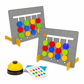 Contém: 2 tabuleiros lógicos com 12 peças coloridas (3 de cada cor) / 4 suportes para os tabuleiros / 24 cartas / 1 campainha